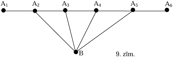 Apzīmēsim šīs \(2\) pilsētas ar \(A_{1}\) un \(A_{6}\), bet četras pilsētas starp tām- ar \(A_{2}, A_{3}, A_{4}\) un \(A_{5}\) (skat. 9.zīm.). Ja kāda cita pilsēta \(B\) ir savienota ar \(4\) vai vairāk no \(A_{1}, A_{2}, \ldots A_{6}\), tad šo pilsētu var izmantot, lai "saīsinātu" īsāko ceļu starp \(A_{1}\) un \(A_{6}\). Piemēram, zīmējumā redzamajā gadījumā posmu \(A_{2}-A_{3}-A_{4}-A_{5}\) var aizstāt ar \(A_{2}-B-A_{5}\). Tāpēc šāda situācija nav iespējama.