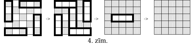 (A) Tā kā galarezultātu nosaka tikai tas, cik reizes katrai rūtiņai ir mainīta krāsa, nav svarīgi, kādā secībā gājieni tiek izdarīti. 4.zīm. parādīts piemērs, kurā ar treknāku līniju apvilktas rūtiņas, kurām tiek mainīta krāsa vienā gājienā.