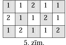 (B) Katrā rūtiņā ierakstīsim skaitli \(1\) vai \(2\) kā redzams 5.zīmējumā: