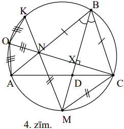 \(\Delta NBC \sim \Delta NOA\), tāpēc \(OA=ON; \Delta NMC \sim \Delta NOK\), tādēl \(OK=ON\).