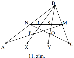 \(\triangle APX=\triangle MPR\), jo \(AX \parallel RM\) un \(AP=PM\) (skat. 11.zīm.). Tādēļ \(AX=RM\). Savukārt \(RM\) ir \(\triangle XBC\) viduslīnija, tāpēc \(XC=2RM\).