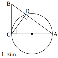 Pieņemsim, ka \(\sphericalangle C=90^{\circ}\), \(AC>BC\) (skat. 1.zīm.). \(\sphericalangle CDA=90^{\circ}\) (ievilkts leņķis, kas balstās uz diametru), tātad \(CD\) ir \(\triangle ABC\) augstums un \(\triangle ABC-\triangle ACD-\triangle CBD\). Apzīmēsim \(AC=b,\ BC=a,\ AB=c,\ CD=h\), \(a^{2}+b^{2}=c^{2}\). Nevar būt, ka \(BD=BC\) (tad \(\triangle CBD\) būtu vienādsānu ar taisnu leņķi pie pamata - nav iespējams), tāpēc \(AD=BC=a\). No \(\triangle ABC-\triangle ACD\) seko