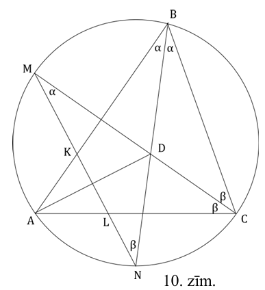 Apzīmēsim \(NM\) krustpunktus ar malām \(AB\) un \(AC\) attiecīgi ar \(K\) un \(L\) (skat. 10.zīm.).