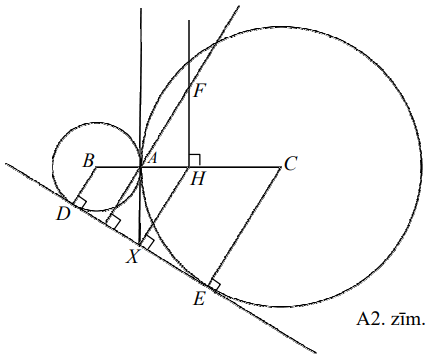 No punkta \(H\) novelkam perpendikulu pret \(DE\), perpendikula un \(DE\) krustpunktu apzīmējam ar \(X\) (skat. A2.zīm.).