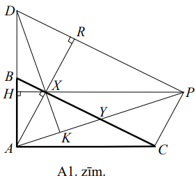 Nogriezni \(AY\) pagarina aiz punkta \(Y\) un atliek punktu \(P\) tā, ka \(AY=YP\) (skat. A1.zīm.). Tas nozīmē, ka četrstūris \(AXPC\) ir paralelograms, jo tā diagonāles \(AP\) un \(XC\) to krustpunktā \(Y\) dalās uz pusēm. Nogriezni \(XP\) pagarinot līdz krustpunktam ar \(AD\), iegūst, ka \(PH \perp AD\), jo \(AC \perp AD\) un \(PH \parallel AC\). Aplūkojam trijstūri \(ADP\). No tā, ka \(AB=BD\) un \(AY=YP\) seko, ka \(BY\) ir trijstūra \(ADP\) viduslīnija. Tātad \(BY \parallel DP\). No tā, ka \(AX \perp BY\), seko, ka \(AR \perp DP\). Tas nozīmē, ka trijstūrī \(ADP\) ir novilkti divi augstumi \(PH\) un \(AR\), kas krustojas punktā \(X\). Līdz ar to nogrieznis, kas vilkts no virsotnes \(D\) caur punktu \(X\), ir trešais šī trijstūra augstums, tātad \(DK \perp AP\) un \(DK \perp AY\), kas arī bija jāpierāda.