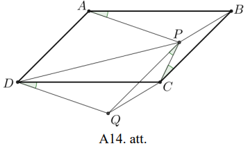 Apzīmējam \(\sphericalangle PAB=\sphericalangle PCB=\alpha\). No virsotnes \(D\) velk nogriezni \(DQ\), kas paralēls \(AP\), bet no \(C\) - nogriezni \(CQ\), kas paralēls \(BP\) (skat. A14.att.). Trijstūri \(ABP\) un \(DCQ\) ir vienādi pēc pazīmes \(\ell m \ell\) un to attiecīgie elementi ir vienādi, t. i., \(PB=QC\) un \(\sphericalangle PAB=\sphericalangle QDC=\alpha\). Tad \(PBCQ\) ir paralelograms, jo \(PB=QC\) un \(PB \parallel QC\). Līdz ar to \(\sphericalangle CPQ=\sphericalangle PCB=\alpha\) kā iekšējie šķērsleņķi pie paralēlām taisnēm \(PQ\) un \(BC\). Ap četrstūri \(DPCQ\) var apvilkt riņķa līniju, jo vienādi leņķi \(\sphericalangle CPQ\) un \(\sphericalangle CDQ\) balstās uz \(CQ\). Tātad \(\sphericalangle PDC=\sphericalangle PQC\), jo abi ir ievilkti leņķi, kas balstās uz hordas \(PC\). Paralelograma \(PBCQ\) pretējie leņķi ir vienādi: \(\sphericalangle PBC=\sphericalangle PQC\). Tātad \(\sphericalangle PBC=\sphericalangle PDC\).