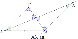 Tā kā \(\sphericalangle LBC=\sphericalangle LBA\) pēc bisektrises definīcijas un \(\sphericalangle LBC=\sphericalangle AKB\) kā iekšējie šķērsleņķi pie paralēlām taisnēm \(BC\) un \(AK\), tad \(\sphericalangle LBA=\sphericalangle AKB\) un trijstūris \(AKB\) ir vienādsānu, pie kam \(AB=AK\) (skat. A3.att.). Arī trijstūris \(AKL\) ir vienādsānu, jo pēc dotā un iepriekš iegūtā \(LK=AB=AK\). Vienādsānu trijstūrim leņķi pie pamata ir vienādi, tāpēc \(\sphericalangle ALK=\sphericalangle LAK\).