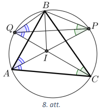 Līdz ar to \(\triangle QIP=\triangle QBP\) pēc pazīmes \(\ell m \ell\), jo \(\sphericalangle IQP=\sphericalangle BQP=\alpha, PQ\) ir kopīga mala un \(\sphericalangle IPQ=\sphericalangle BPQ=\beta\). Tāpēc \(PI=PB\) kā atbilstošās malas vienādos trijstūros un \(\triangle BPI\) ir vienādsānu trijstūris ar pamatu \(BI\). Tā kā \(PQ\) ir bisektrise, kas vilkta no virsotnes leņķa, tad \(PQ\) ir arī augstums pret \(BI\) un līdz ar to \(PQ \perp BI\).