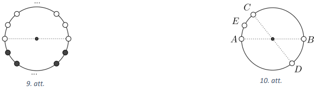 Pieņemsim, ka melnas nokrāsotas ne vairāk kā \(1006\) virsotnes, tad baltas ir palikušas vismaz \(1010\) virsotnes. Tā kā ir tieši \(1008\) diametri, kuriem abi galapunkti atrodas regulārā \(2016\) - stūra virsotnēs, tad būs vismaz divi diametri kuriem abi galapunkti ir balti (Dirihlē princips). Šos diametrus apzīmējam ar \(AB\) un \(CD\) (skat. 10.att.). Izvēlamies kādu punktu \(E\), kurš ir balts (nezaudējot vispārīgumu, varam pieņemt, ka tas atrodas uz loka \(AC\)), bet tad trijstūris \(BDE\) ir šaurleņķu, jo visi trīs loki \(EB,\ BD,\ DE\) ir mazāki nekā \(180^{\circ}\), tātad trijstūra leņķi ir mazāki nekā \(90^{\circ}\), jo tie ir ievilktie leņķi, kas balstās uz šiem lokiem.