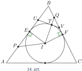 Trijstūrī \(ABC\) ievilktās riņķa līnijas \(\omega\) centrs ir \(I\). Uz malām \(AB\) un \(BC\) izvēlēti attiecīgi punkti \(P\) un \(Q\) tā, ka \(PI=QI\) un \(PB>QB\). Nogrieznis \(QI\) krusto \(\omega\) punktā \(T\). Taisne, kas pieskaras \(\omega\) punktā \(T\), krusto malas \(AB\) un \(BC\) attiecīgi punktos \(U\) un \(V\). Pierādīt, ka \(PU=UV+VQ\) !