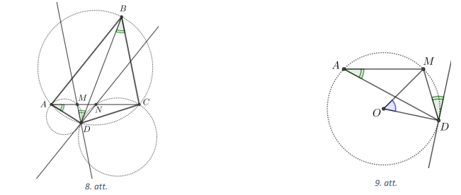 Pamatosim, ka ap \(AMD\) apvilktā riņķa līnija pieskaras taisnei \(BD\). Ar \(O\) apzīmējam trijstūrim \(AMD\) apvilktās riņķa līnijas centru (skat. 9.att.). Ja \(\sphericalangle DAC=\sphericalangle BDM=\alpha\), tad \(\sphericalangle MOD=2 \alpha\) kā atbilstošais centra leņķis. Tā kā trijstūris \(MOD\) ir vienādsānu, tad \(\sphericalangle ODM=\frac{180^{\circ}-2 \alpha}{2}=90^{\circ}-\alpha\). Līdz ar to \(\sphericalangle ODB=90^{\circ}-\alpha+\alpha=90^{\circ}\). Tā kā rādiuss \(OD\) ir perpendikulārs taisnei \(BD\), tad \(BD\) ir pieskare.