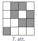 Pamatosim, ka lielākām \(N\) vērtībām īpašība nav spēkā visām tabulām. Ja \(N=7\), tad īpašība nav spēkā, piemēram, 7.att. dotajam rūtiņu izvietojumam. Ievērojam, ka, izvēloties jebkuras divas rindas, paliek trīs kolonnas, kurās atrodas iekrāsotās rūtiņas.
