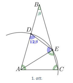 Vienādsānu trijstūrī \(ABC\) virsotnes leņķis \(\sphericalangle ABC=\beta\). Ar centru punktā \(A\) un rādiusu \(AC\) novilkta riņķa līnija, kas krusto malas \(AB\) un \(BC\) attiecīgi punktos \(D\) un \(E\). Zināms, ka \(\sphericalangle ADE=12 \beta\). Aprēķināt \(\beta\) lielumu!