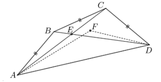 Dots izliekts četrstūris \(ABCD\), kuram \(AB=BC=CD\). Četrstūra diagonāles krustojas punktā \(E\), bet leņķu \(BAD\) un \(ADC\) bisektrises krustojas punktā \(F\). Pierādīt, ka \(\sphericalangle EAF = \sphericalangle EDF\).
