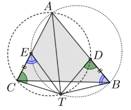 Uz dažādmalu trijstūra \(ABC\) malām \(AB\) un \(AC\) attiecīgi izvēlēti tādi punkti \(D\) un \(E\), ka \(BD = CE\). Trijstūriem \(ABE\) un \(ACD\) apvilktās riņķa līnijas krustojas vēl arī punktā \(T\). Pierādīt, ka \(AT\) ir leņķa \(BAC\) bisektrise!