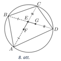 Izmantojot krustisku hordu īpašību, iegūstam, ka \(BE \cdot ED = AE \cdot CE\) (skat. 8. att.). Izsakām nogriežṇus \(ED\) un \(AE\): - \(ED = EG + GD = EG + CE\); - \(AE = AF + FE = BE + EF\).