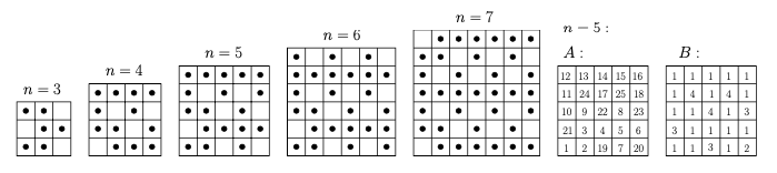 For \(n=1\) and \(n=2\) the markings are respectively the lone field and the L-trimino. Now, for \(n>2\), let \(s=2\) for \(n \equiv 0,2 \bmod 3\) and \(s=1\) for \(n \equiv 1 \bmod 3\). We will take indices \(k\) and \(l\) to be arbitrary non-negative integers. For \(n \geqslant 3\) we will construct a path of marked squares in the first two columns consisting of all squares of the form \((1, i)\) where \(i\) is not of the form \(6 k+s\) and \((2, j)\) where \(j\) is of the form \(6 k+s-1,6 k+s\) or \(6+s+1\). Obviously, this path is connected. Now, let us consider the fields \((2,6 k+s)\) and \((1,6 k+s+3)\). For each considered field \((i, j)\) we will mark all squares of the form \((l, j)\) for \(l>i\) and \((i+2 k, j \pm 1)\). One can easily see that no set of marked fields will produce a cycle, that the only fields of the unmarked form \((1,6 k+s),(2+2 l+1,6 k+s \pm 1)\) and \((2+2 l, 6 k+s+3 \pm 1)\) and that no two are adjacent, since the consecutive considered fields are in columns of opposite parity. Examples of markings are given for \(n=3,4,5,6,7\), and the corresponding constructions for \(A\) and \(B\) are given for \(n=5\).