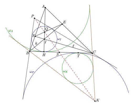 so \(S=S^{\prime}\) indeed. Finally, by applying the generalised Monge's theorem to the circles \(\omega_{A}\), \(\omega_{I}\), and \(\omega_{K}\) (with two pairs of internal and one pair of external common tangents), we can see that points \(Q\), \(S\), and \(K\) are collinear. Similarly one can show that \(Q,S\) and \(P\) are collinear, and the result follows. Solution 2. Again, let \(B E\) and \(C F\) meet at \(I\), that is the incentre in triangle \(B C P\); then \(P I\) is the third angle bisector. From the tangent segments of the incircle we have \(BP - CP = \mathrm{BH}-\mathrm{CH}\); hence, the possible points \(P\) lie on a branch of a hyperbola \(\mathcal{H}\) with foci \(B,C\), and \(H\) is a vertex of \(\mathcal{H}\). Since \(PI\) bisects the angle between the radii \(BP\) and \(CP\) of the hyperbola, line \(PI\) is tangent to \(\mathcal{H}\).  Let \(K\) be the second intersection of \(P Q\) and \(\mathcal{H}\), we will show that \(A K\) is tangent to \(\mathcal{H}\) at \(K\); this property determines \(K\). Let \(G=K I \cap A P\) and \(M=P I \cap A K\). From the complete quadrangle \(B C E F\) we can see that \((H, Q ; I, A)\) is harmonic, so in the complete quadrangle \(A P I K\), point \(H\) lies on line \(G M\). Consider triangle \(AIM\). Its side \(A I\) is tangent to \(\mathcal{H}\) at \(H\), the side \(I M\) is tangent to \(\mathcal{H}\) at \(P\), and \(K\) is a common point of the third side \(A M\) and the hyperbola such that the lines \(A P\), \(I K\) and \(M H\) are concurrent at the generalised Gergonne-point \(G\). It follows that the third side, \(A M\) is also tangent to \(\mathcal{H}\) at \(K\). (Alternatively, in the last step we can apply the converse of Brianchon's theorem to the degenerate hexagon \(A H I P M K\). By the theorem there is a conic section \(\mathcal{H}^{\prime}\) such that lines \(A I, I M\) and \(M A\) are tangent to \(\mathcal{H}^{\prime}\) at \(H, P\) and \(K\), respectively. But the three points \(H, K\) and \(P\), together with the tangents at \(H\) and \(P\) uniquely determine \(\mathcal{H}^{\prime}\), so indeed \(\mathcal{H}^{\prime}=\mathcal{H}\).)