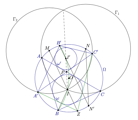 Further define \(P\) as the intersection of \(A C\) and \(A^{\prime} C^{\prime}\) and \(M\) as the antipode of \(N^{\prime}\) in \(\Omega\). Consider the circle \(\Gamma_{1}\) with centre \(N\) and radius \(N A=N C\) and the circle \(\Gamma_{2}\) with centre \(M\) and radius \(M A^{\prime}=M C^{\prime}\). Their radical axis passes through \(P\) and is perpendicular to \(M N \perp N N^{\prime} \| I P\), so \(I\) lies on their radical axis. Therefore, since \(I\) lies on \(\Gamma_{1}\), it must also lie on \(\Gamma_{2}\). Thus, if we define \(Z\) as the second intersection of \(M I\) with \(\Omega\), we have that \(I\) is the incentre of triangle \(Z A^{\prime} C^{\prime}\). (Note that the point \(Z\) can also be constructed directly via Poncelet's porism.)