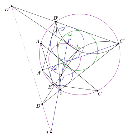 The external centre of dilation from \(\omega\) to \(\omega_{c}\) is the intersection of \(I I_{c}\) and \(C^{\prime} Z(D\) in the picture), that is the radical centre of circles \(\Omega, C^{\prime} I_{c} I Z\) and \(I I^{\prime} I_{c}\). Similarly, the external centre of dilation from \(\omega^{\prime}\) to \(\omega_{c}\) is the intersection of \(I^{\prime} I_{c}\) and \(B^{\prime} C^{\prime}\) ( \(D^{\prime}\) in the picture), that is the radical centre of circles \(\Omega, B^{\prime} I^{\prime} I_{c} C^{\prime}\) and \(I I^{\prime} I_{c}\). Therefore the Monge line of \(\omega, \omega^{\prime}\) and \(\omega_{c}\) is line \(D D^{\prime}\), and the radical axis of \(\Omega\) and circle \(I I^{\prime} I_{c}\) coincide. Hence the external centre \(T\) of dilation from \(\omega\) to \(\omega^{\prime}\) is also on the radical axis of \(\Omega\) and circle \(I I^{\prime} I_{c}\).