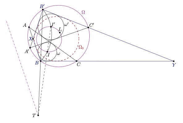 Now since \(B, I, I^{\prime}, B^{\prime}\) are concyclic, the intersection \(T^{\prime}\) of \(B B^{\prime}\) and \(I I^{\prime}\) is on the radical axis of \(\Omega\) and circle \(I I^{\prime} I_{c}\). Thus \(T^{\prime}=T\) and \(T\) lies on line \(B B^{\prime}\). Finally, construct a circle \(\Omega_{0}\) tangent to \(A^{\prime} B^{\prime}, B^{\prime} C^{\prime}, A B\) on the same side of these lines as \(\omega^{\prime}\). The centre of dilation from \(\omega^{\prime}\) to \(\Omega_{0}\) is \(B^{\prime}\), so by Monge's theorem the external centre of dilation from \(\Omega_{0}\) to \(\omega\) must be on the line \(T B B^{\prime}\). However, it is on line \(A B\), so it must be \(B\) and \(B C\) must be tangent to \(\Omega_{0}\) as desired.